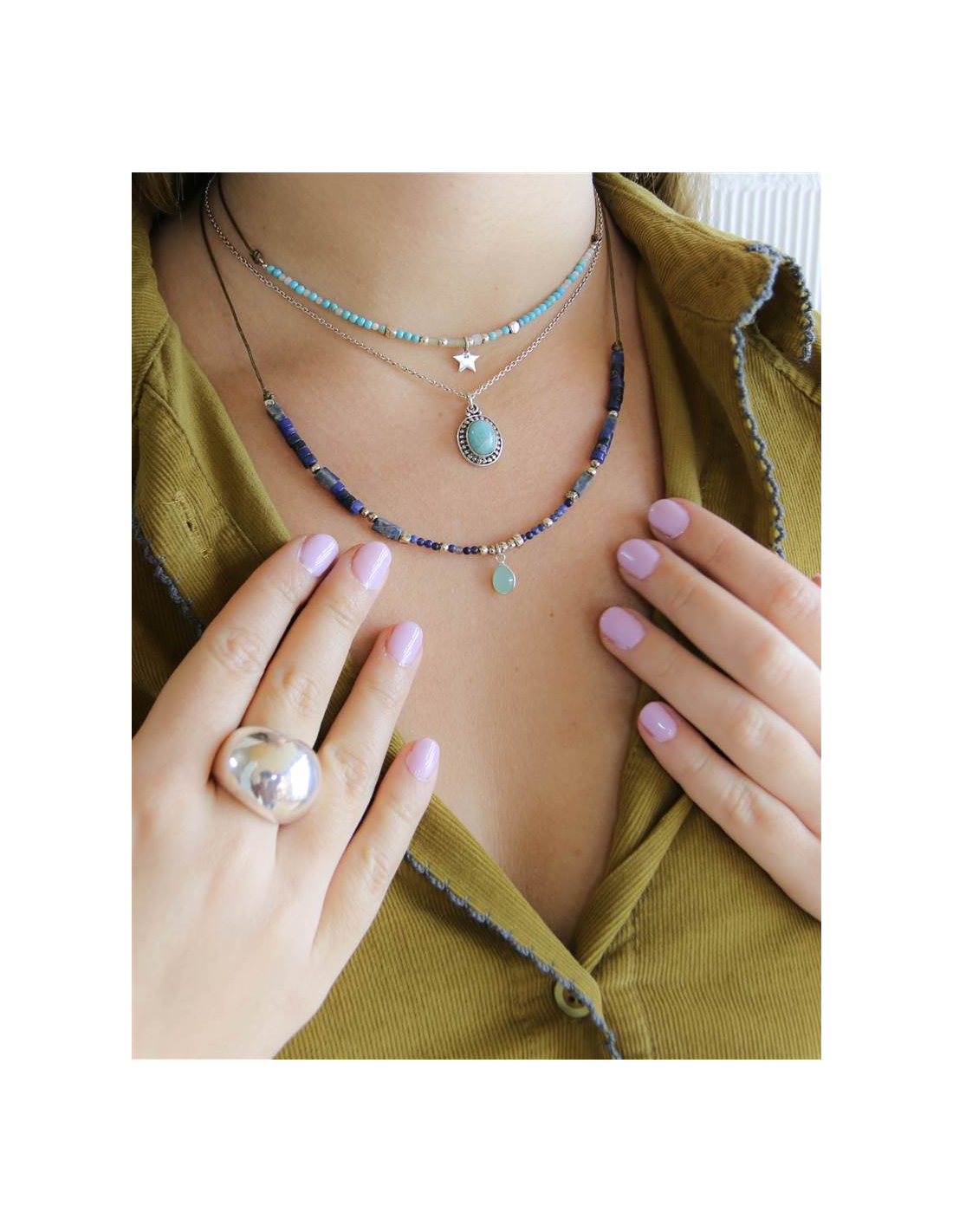 La piedra de forma ovalada rodeada por una filigrana de bolitas envejecidas de plata.