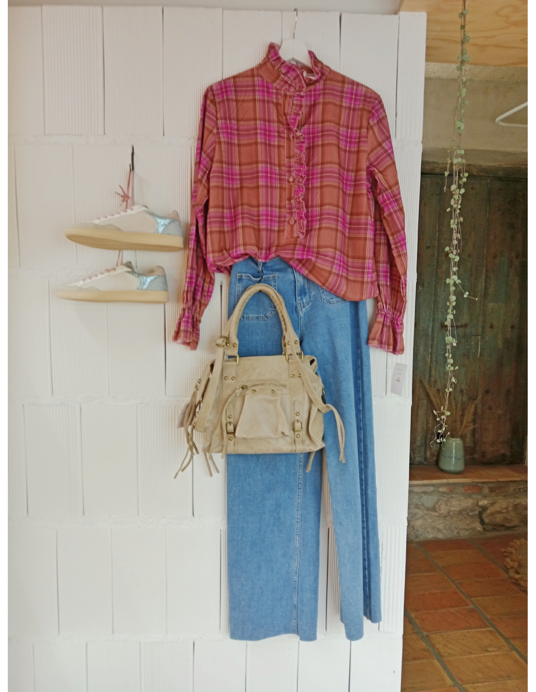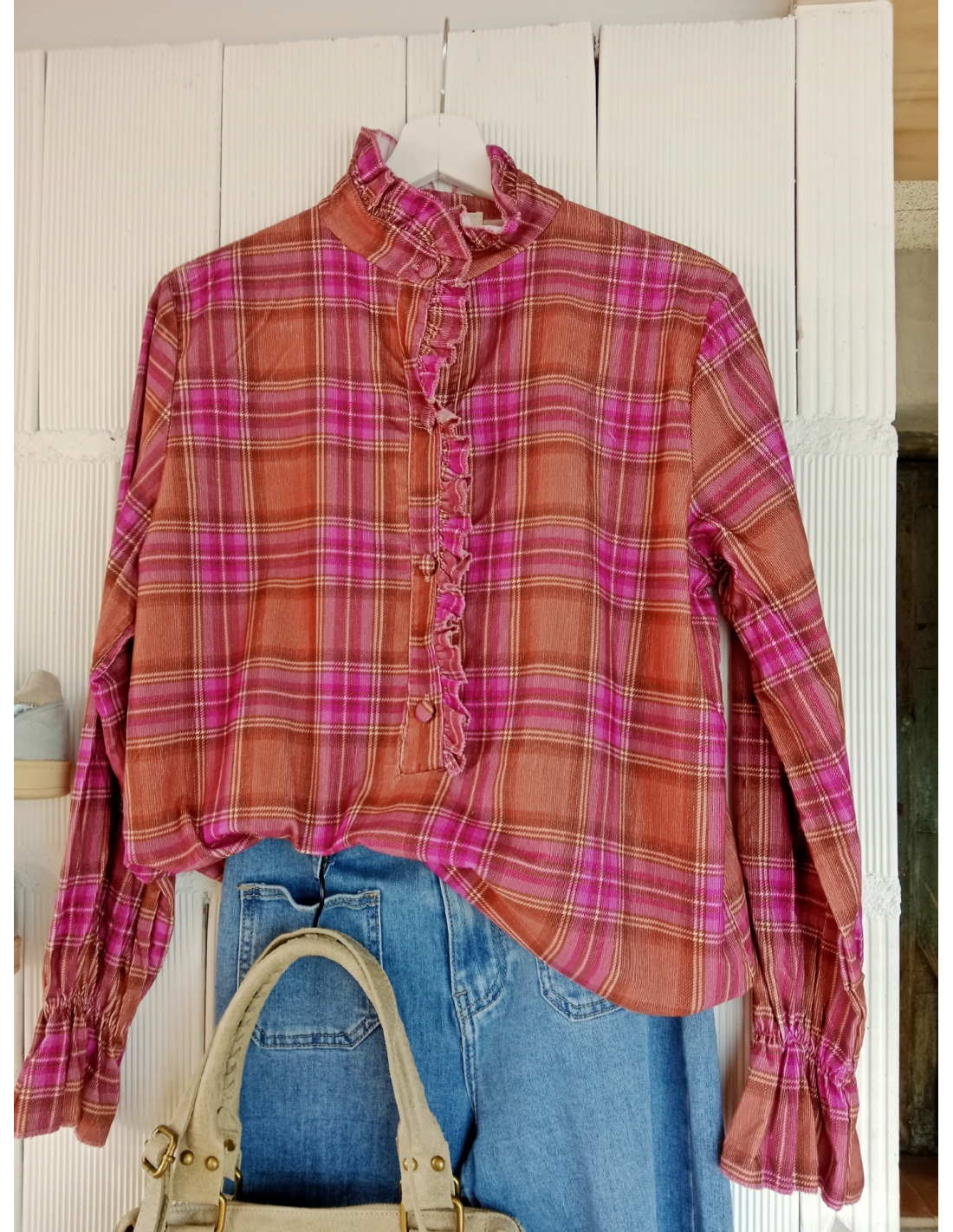 Camisa de cuadros, de pana finita, cuello alto con volante.