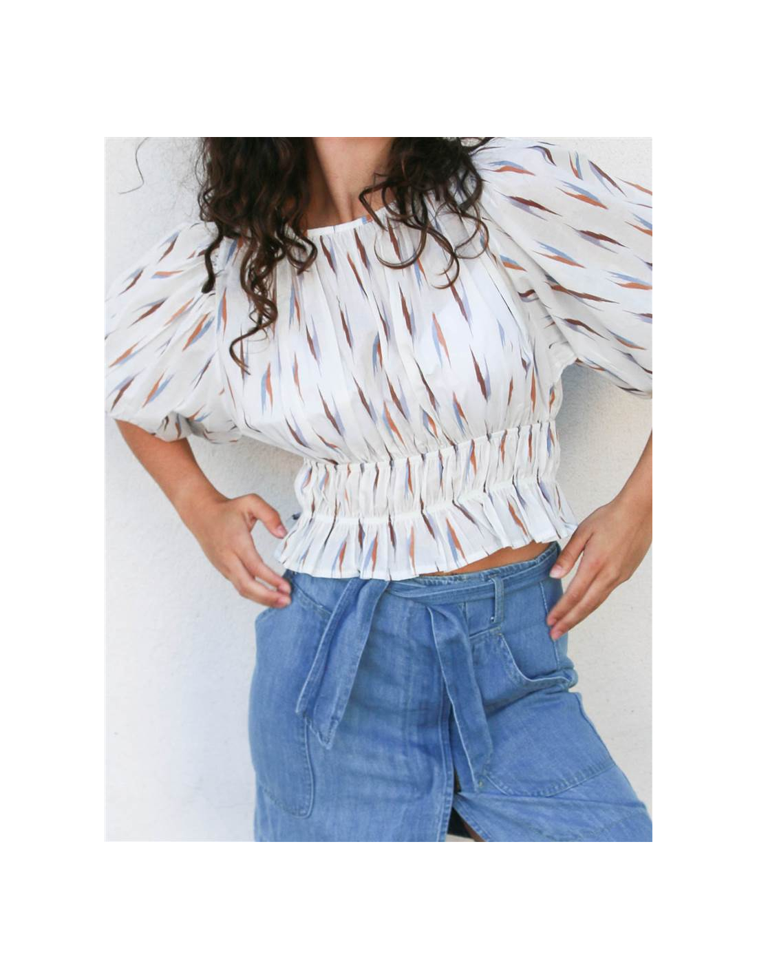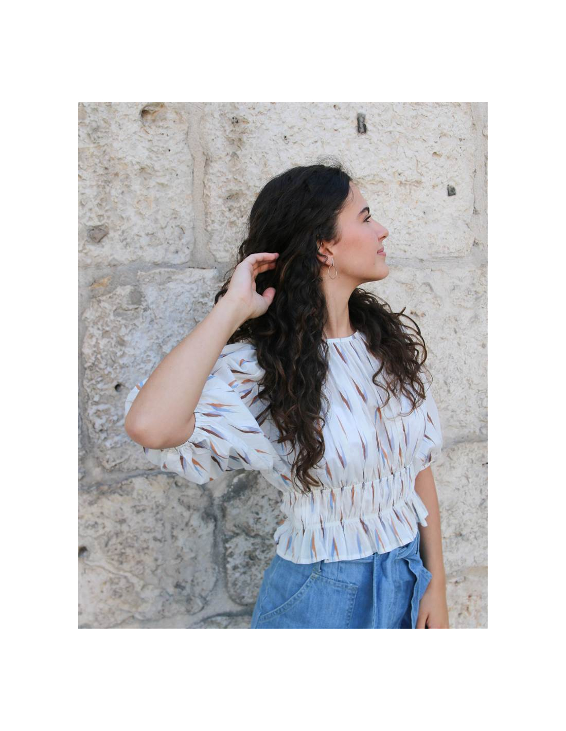 Top con detalles en distintas tonalidades y con cuello redondo.