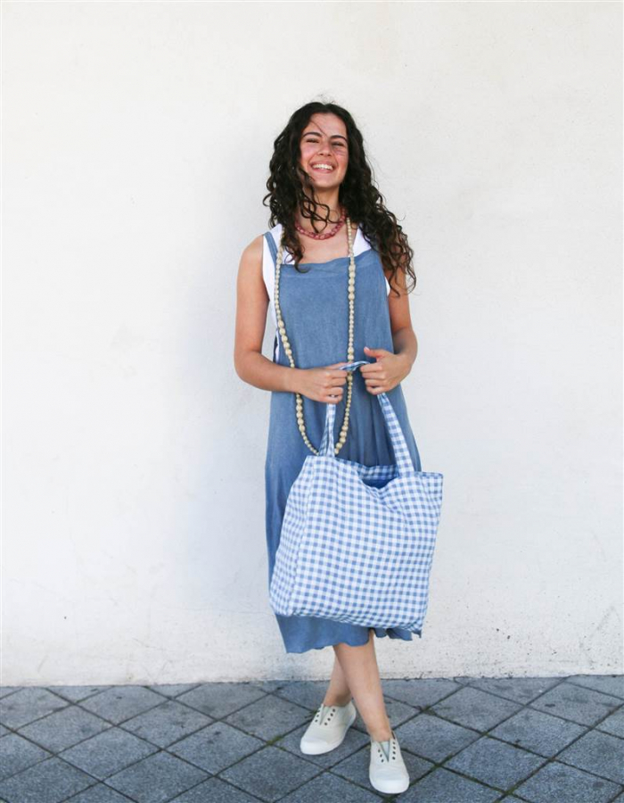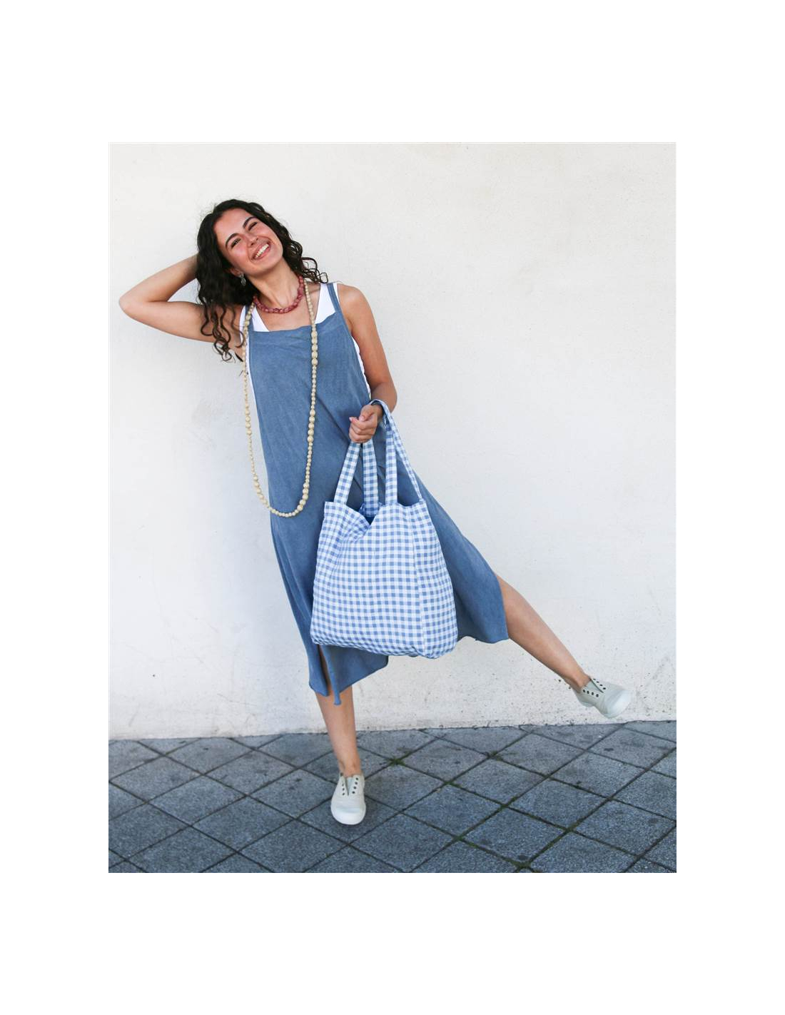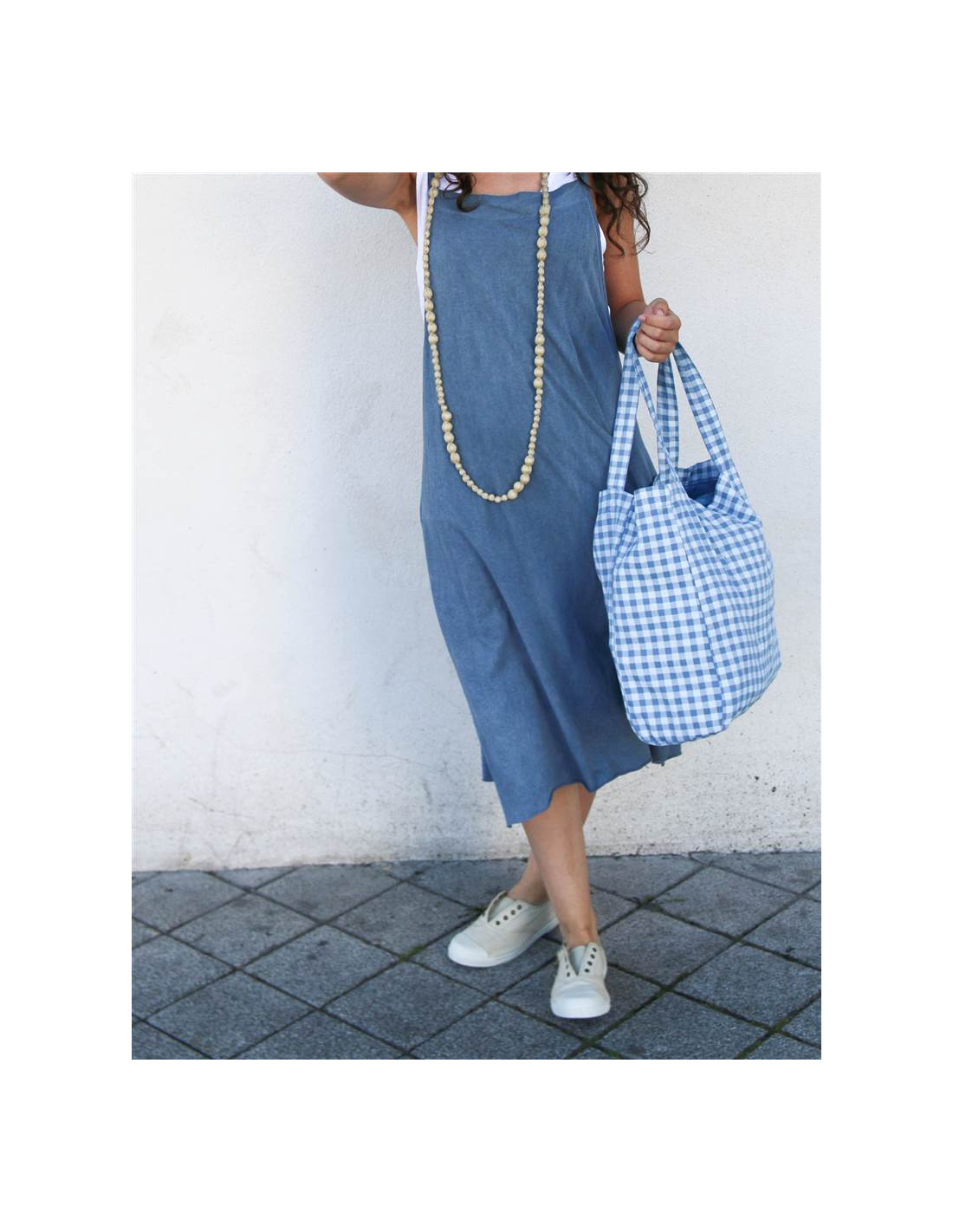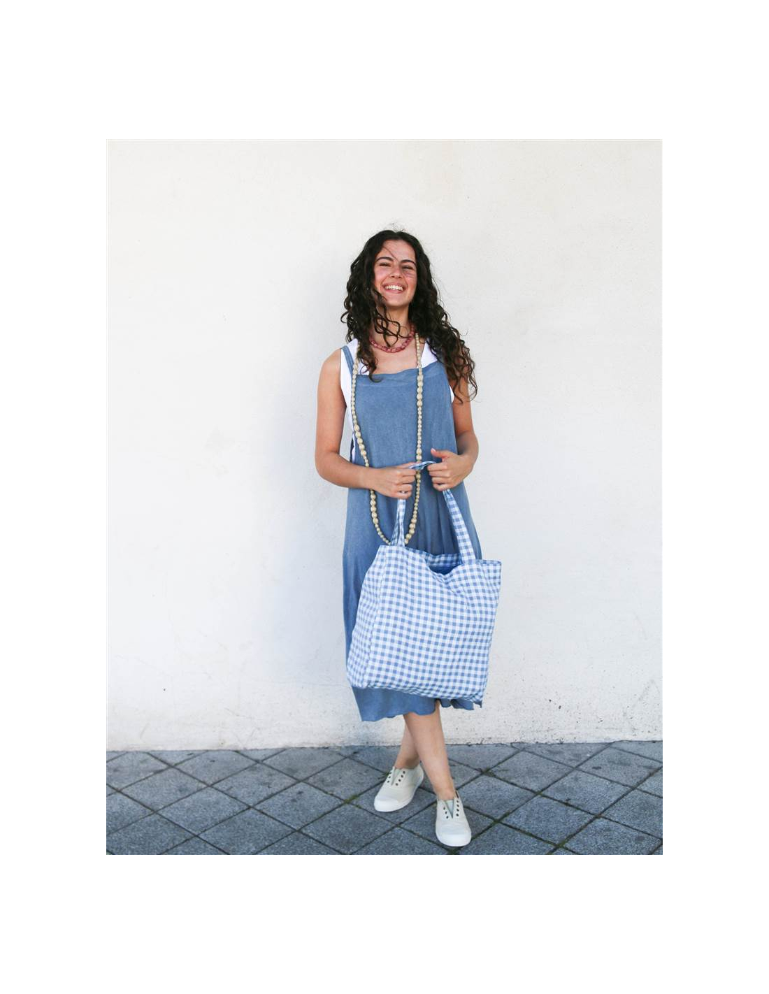 Bolso de loneta 100% algodón, se cierra con botón y cuenta con un bolsillo interior.