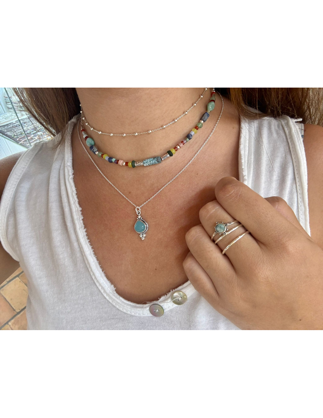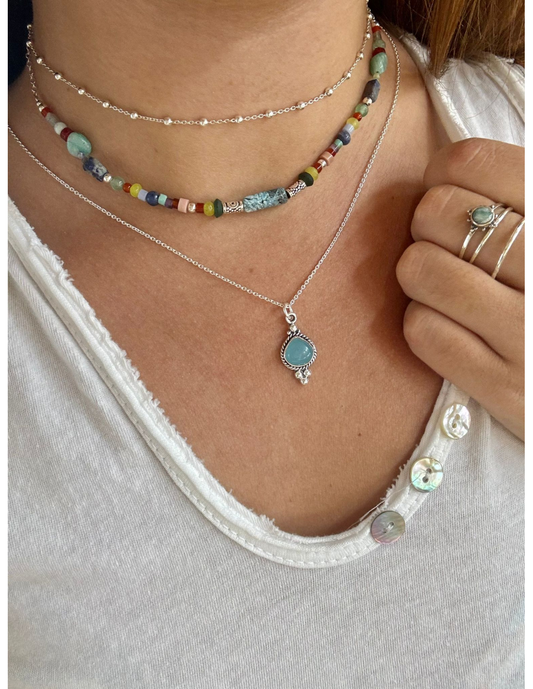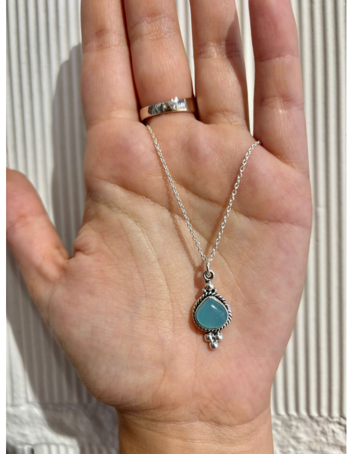 Colgante formado por una cadena finita de plata y una piedra natural de calcedonia gran protagonista rodeada de plata.
