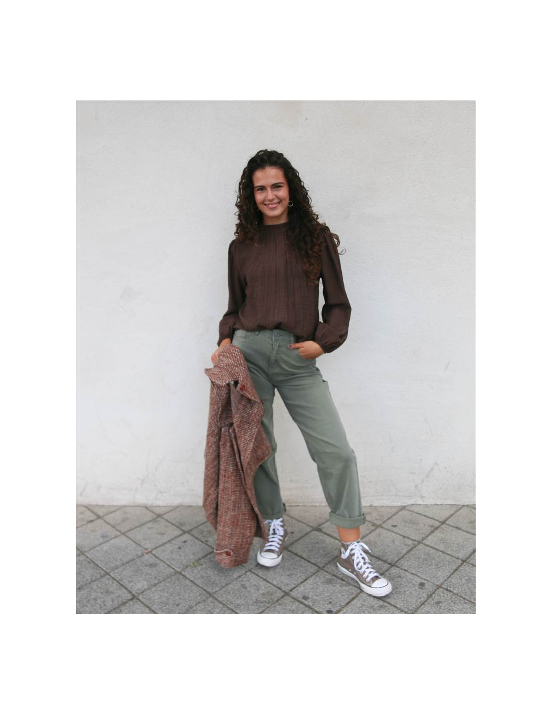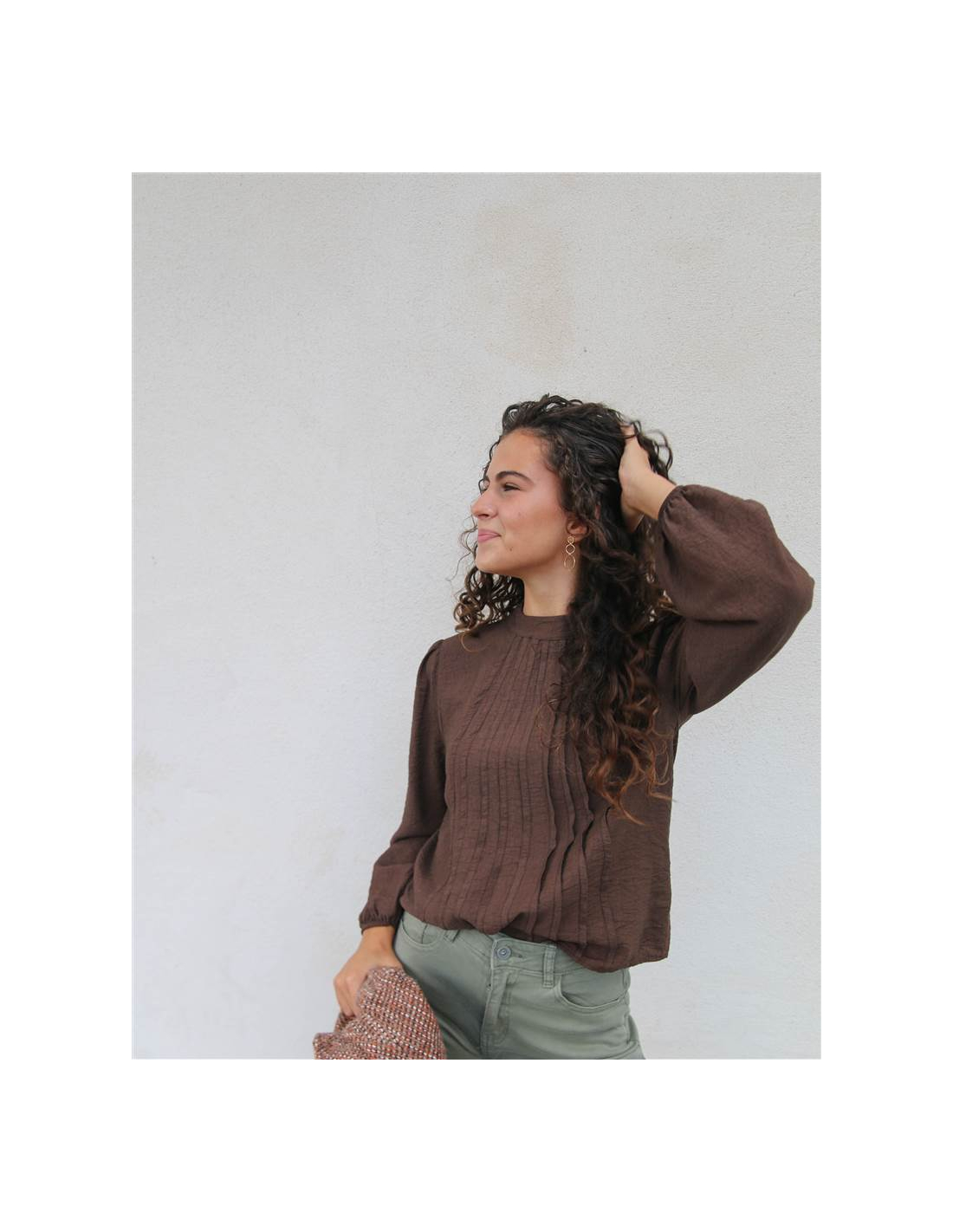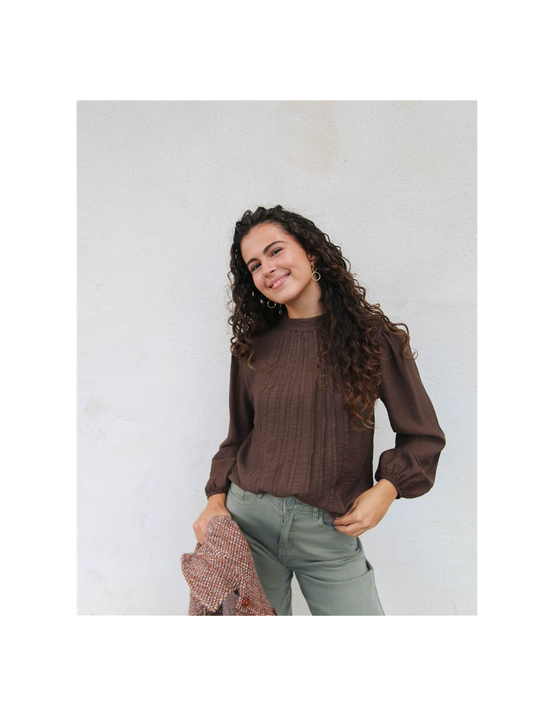 Lleva jaretas verticales y manga ligeramente abullonada.