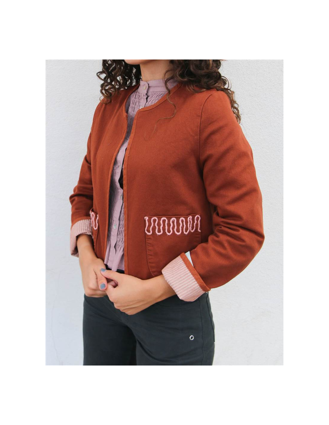 Chaqueta algodón abierta y cuello redondo.