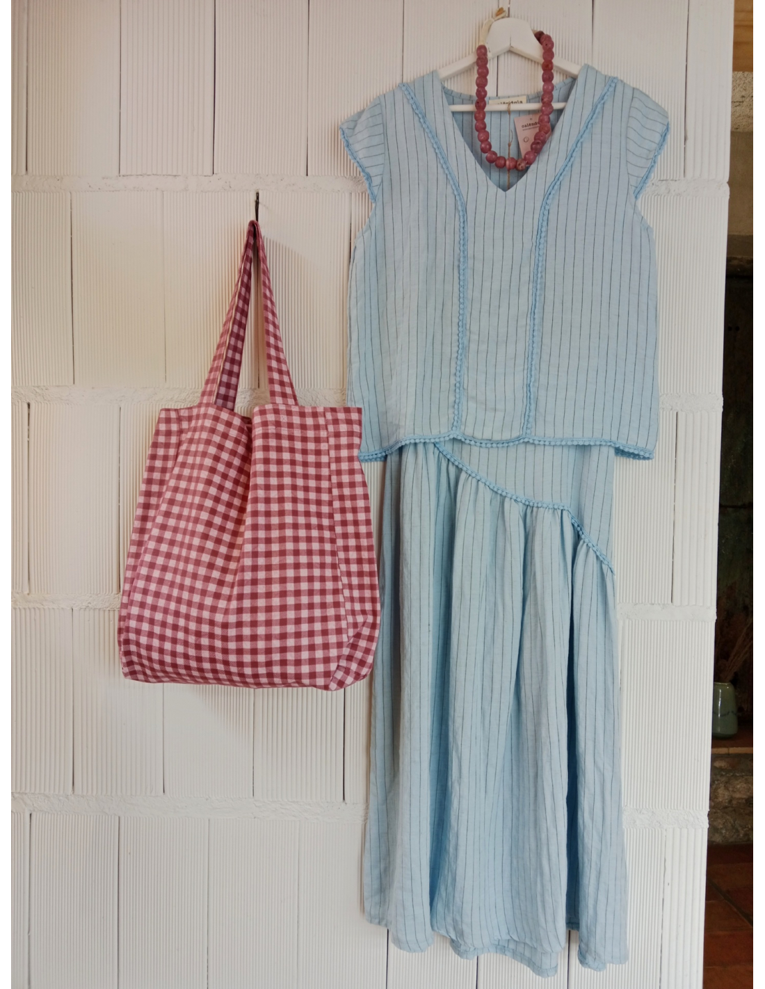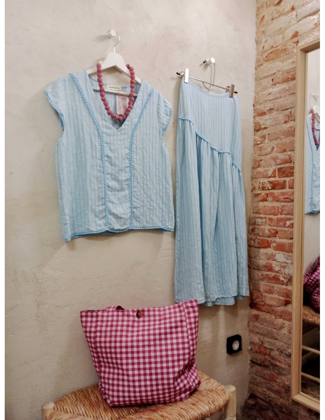 Camisa de raya fina, tejido ligero y detalles en azul celeste.