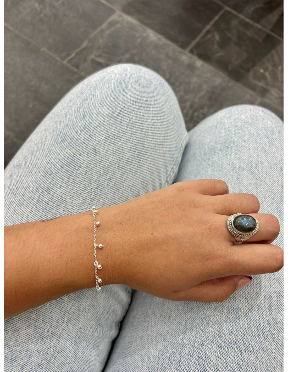 Pulsera con bolitas de plata que caen en forma de cascada.