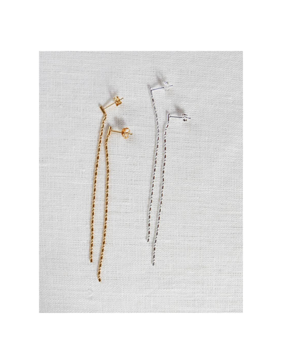 Pendientes largos, formados por pequeñas barritas y mini círculos.
